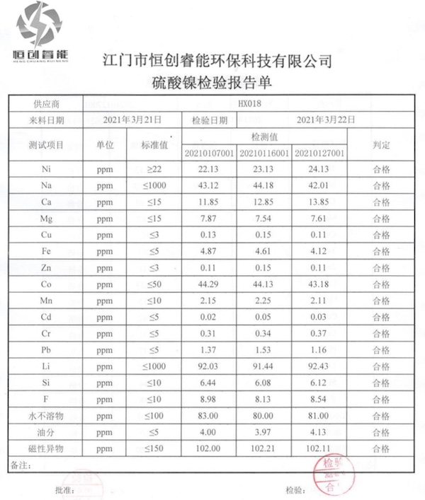 硫酸鎳是一種無機物,有無水物(NiSO4)、六水物和七水物三種。商品多為六水物,有α-型和β-型兩種變體,前者為藍色四方結晶,后者為綠色單斜結晶。加熱至103°C時失去六個結晶水。易溶于水,微溶于乙醇、甲醇,其水溶液呈酸性,微溶于酸、氨水,有毒。主要用于電鍍工業,是電鍍鎳和化學鎳的主要鎳鹽,也是金屬鎳離子的來源,能在電鍍過程中,離解鎳離子和硫酸根離子。