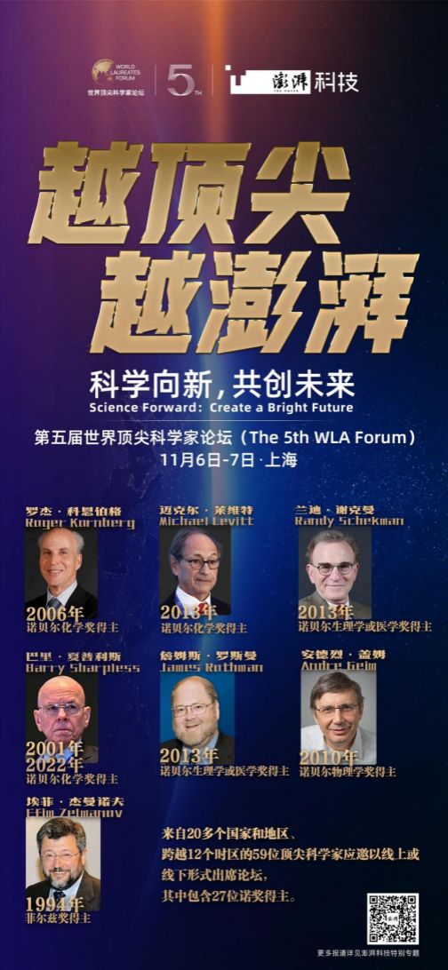 11月6日,第五屆世界頂尖科學家論壇開幕式在上海舉行。本屆論壇由世界頂尖科學家協會、中國科學技術協會、中央廣播電視總臺主辦。論壇的主題是“科學向新 共創未來”。中共上海市委書記陳吉寧,中國科學技術協會主席萬鋼,中宣部副部長、中央廣播電視總臺臺長慎海雄,世界頂尖科學家協會主席、2006年諾貝爾化學獎得主羅杰·科恩伯格出席開幕式并發表致辭。中國科學技術協會黨組書記、分管日常工作副主席張玉卓主持開幕式。27位諾貝爾獎得主與30余位中國兩院院士組成“頂科天團”,與50余位青年科學家、100余位“小科學家” 和各界嘉賓以線上或線下形式出席論壇。
