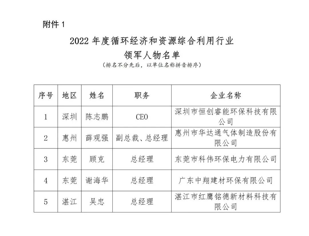 根據《關于開展2022年度循環經濟和資源綜合利用行業領軍人物和先進個人評選的通知》(粵循綜協〔2022〕264號)要求,經會員單位自薦和協會工作小組評選,擬確定5名循環經濟和資源綜合利用行業領軍人物,6名行業先進個人,現將名單予以公示。