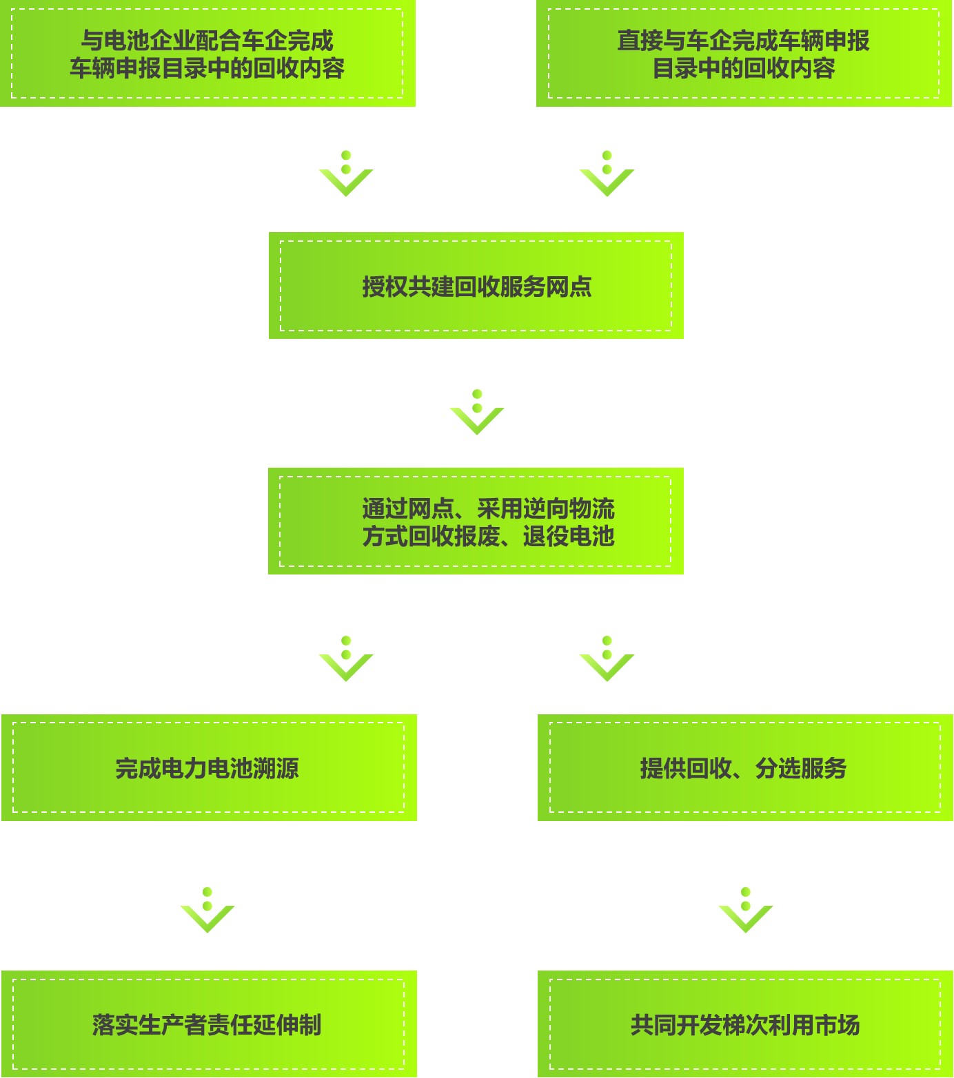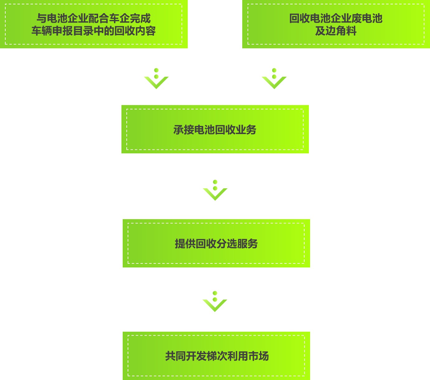 我們與汽車企業共同構建回收服務網點,通過網點回收報廢、退役電池,建立電池溯源機制,落實好生產者責任延伸制,對回收的報廢、退役電池檢測分選,輕度報廢電池將應用在儲能設備及低速電動車,重度報廢電池則進行拆解再生成電極材料及外殼包裝。